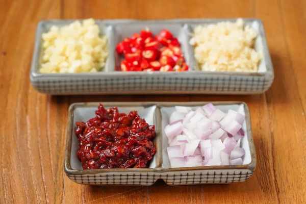 4. 3根小米椒洗淨去蒂切圈,4瓣大蒜切成蒜泥,3片薑切成薑末,1撮小葱切成蔥花,四分之一個洋葱切碎。