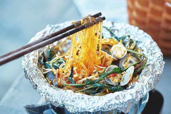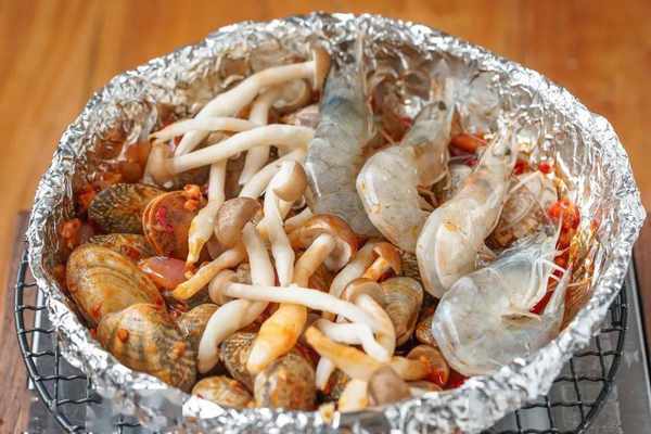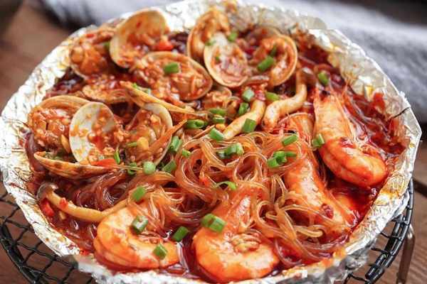 花甲粉得是錫紙包的,導熱快,食物也能充分熟透入味。把錫紙窩成個碗的形狀,直接放在火上煮開,豆瓣醬香、辣椒微嗆。