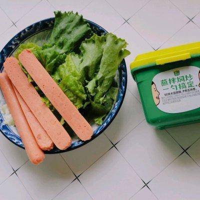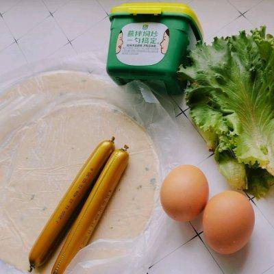 7.放上生菜和火腿腸,用筷子把它們卷起來