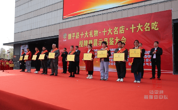 會議宣讀瞭鎮平縣“十大名店”“十大名吃”名單;鎮平縣玉鄉有禮“十大禮物”名單;並現場進行授牌。
