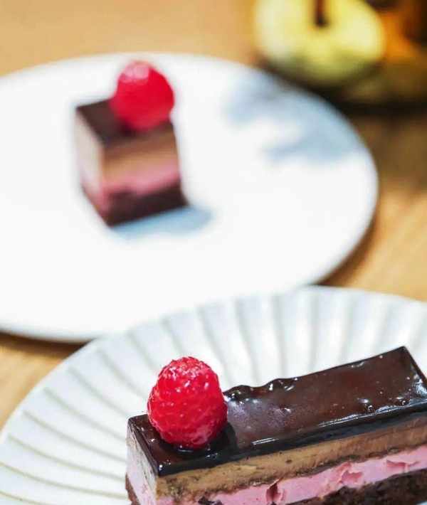 接下來登場的是秘魯70%黑巧樹莓慕斯。雖然同是果香調突出的豆子,但秘魯產的原豆和海南的風味截然不同,主調是非常熱情而張揚的莓果香,前者如明艷的熱帶美女,後者像溫婉的東方麗人。淺烘的方式使更加精致的番茄、蓮霧風味得以保留,豐富的單寧又給整道甜品增加瞭紅酒香氣。搭配新鮮樹莓,再以酒漬櫻桃點綴其中,這道黑巧樹莓慕斯擁有動人心魄的甜美,但搭配渾然天成,質樸可愛,完全沒有做作的甜膩。