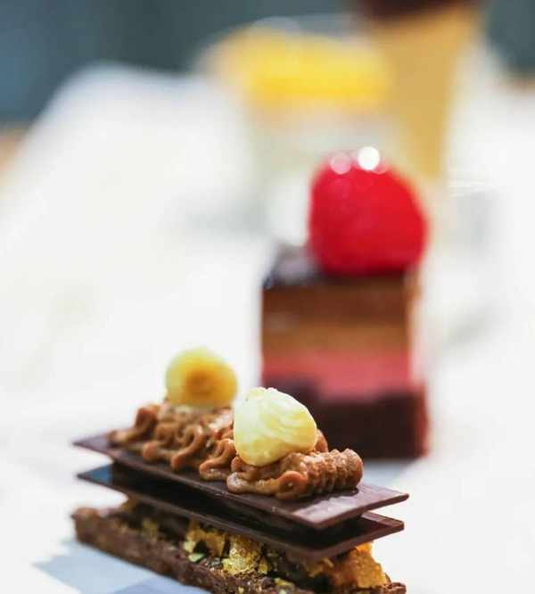 最後隆重登場的是加納70%黑巧榛子迷你拿破侖。如果你是濃鬱巧克力香的粉絲,加納這款原豆絕對擁有C位的光環。如果說各種復雜的香氣難免會遭遇不同的口味偏好,總是“各花入各眼”,深沉又溫暖的加納可可豆大概可以統一巧克力口味的審美,微妙的肉桂香氣和堅果餘韻又讓原豆的性格變得豐滿而立體。搭配榛子醬、自制的巧克力榛子脆片和鮮奶油,小小一塊拿破侖能滿足你對巧克力的一切想象。醉過才知酒濃,吃過這片拿破侖,再吃其他甜品都難免覺得寡淡,因此它最適合作為整場產地探秘之旅的收尾,留下悠長的餘韻供你久久回味。