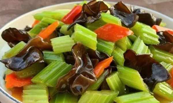 3、鍋裡放兩勺油,油熱放蔥蒜,幹辣椒爆香,再放木耳炒熟,最後加入芹菜、彩椒,一勺耗油,兩勺生抽,少許鹽,翻炒一分鐘即可出鍋。