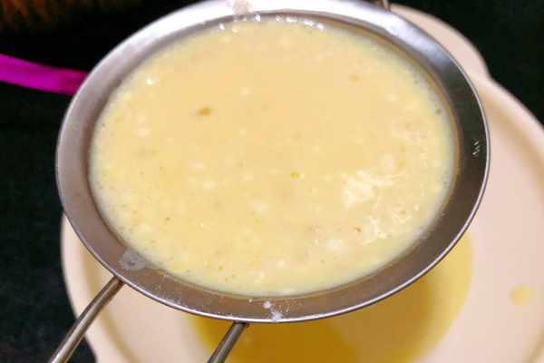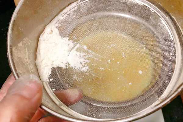 餅皮液裡有很多顆粒,會影響餅皮的口感,所以用篩網過濾一下。