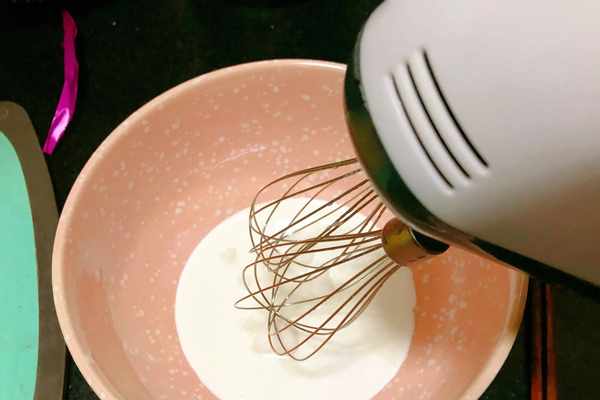 千層蛋糕的奶油打發,需要打發得幹硬一下。