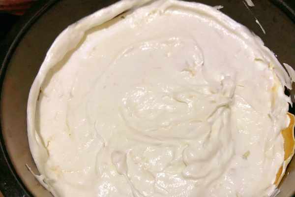 然後把打發好的奶油和榴蓮肉攪拌在一起。一層餅,一層奶油榴蓮肉,一層一層疊加起來。裝在戚風蛋糕模具裡,冰箱冷藏兩個小時以上。