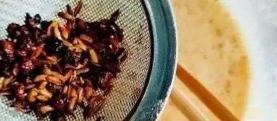 3、用過濾網將炒勺中的花椒和小茴香過濾掉, 將燒開的油倒入裝好面粉的碗中,用筷子快速攪拌均勻。