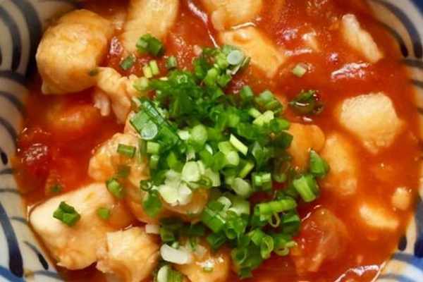 2、番茄用開水焯燙以後去掉表皮切成小塊,在炒鍋中放適量食用油加熱,把番茄入鍋炒成泥,再放入適量的香蔥末,隨後加適量清水煮開後,把龍利魚肉入鍋煮2~3分鐘,放入白糖,食用鹽和黑胡椒粉以及少量的玉米淀粉再煮一分鐘就能出鍋。