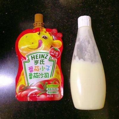 1.準備好所有材料:沙拉醬、番茄醬、生菜、黃瓜片、黃瓜條和黃瓜絲。