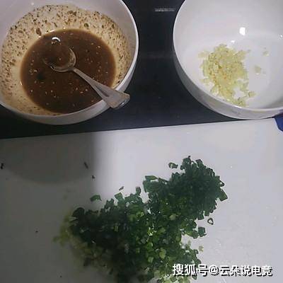 2.準備每種調味料一勺,加入三勺水,攪拌均勻。切蔥花和大蒜。