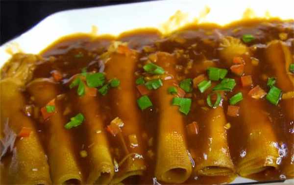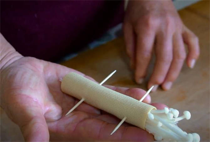 5.這個豆腐皮我們來卷金針菇,這樣卷上它。