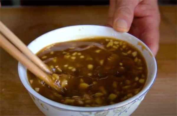 7.再切點蒜,加點素蠔油,倒點生抽,放一勺鹽,放2勺糖,加入一碗水,放上2勺淀粉,用筷子攪勻。
