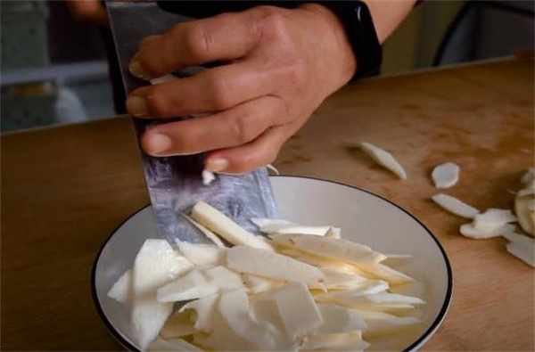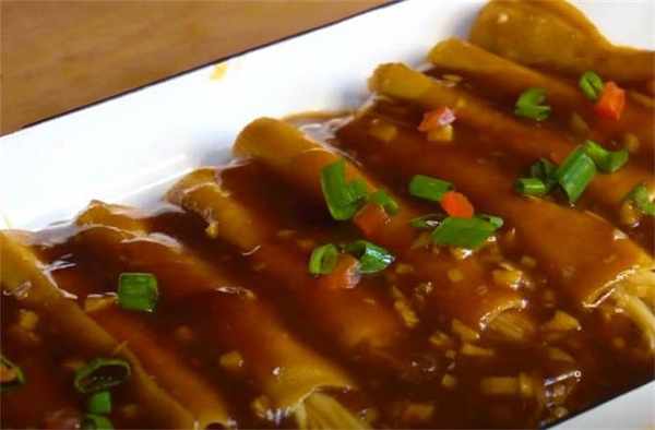 4.這個時候咱們再做個菜,準備兩張豆腐皮,用刀切成這麼寬就行。