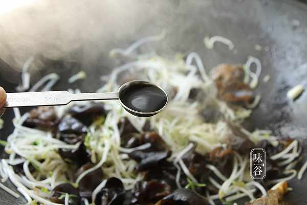 2、起鍋燒油,放蒜片爆香。然後下洗凈的綠豆芽和木耳翻炒,使豆芽被烘出水汽,在鍋邊烹入一點香醋,去除豆腥味。