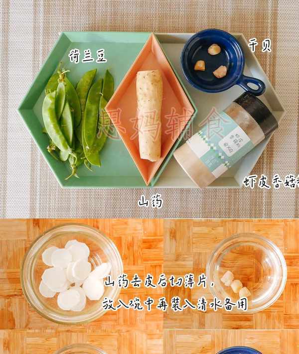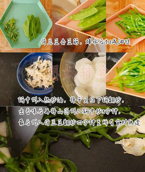 4.鍋中倒入熱炒油,將幹貝絲下鍋翻炒,出香味後再將山藥倒入鍋中炒3分鐘,最後倒入荷蘭豆翻炒四分鐘至所有食材熟透