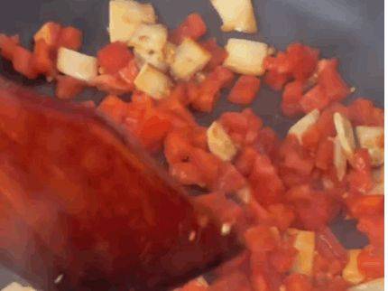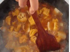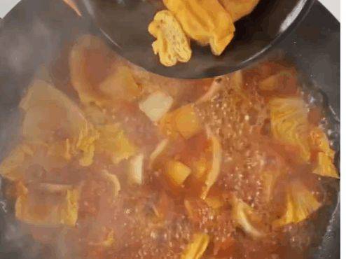 4. 下番茄碎大火翻炒出汁,最後加入油豆泡和娃娃菜翻炒,加入水,醬油和素肉燥,大火燒開,小火煮7分鐘;