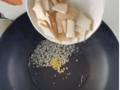 3. 熱鍋中放5g油,爆香薑絲,下平杏鮑菇大火煸2分鐘,至水分略微收幹;