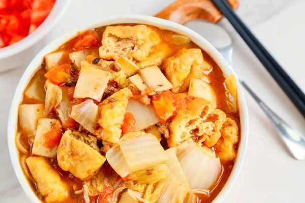 今天用到的娃娃菜提供膳食纖維和礦物質,豆泡提供蛋白質,一勺素肉燥的加入讓湯底多瞭醇厚濃鬱的味道,白胡椒粉微辣暖身,增加層次感。
