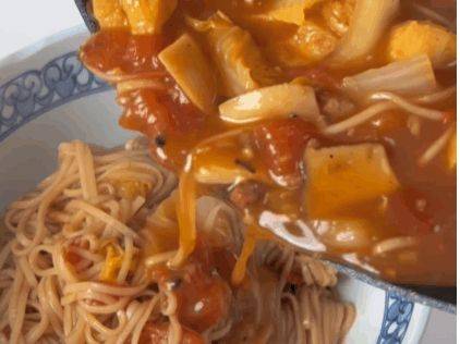 - 材料 -番茄 150g、杏鮑菇 50g、娃娃菜 100g油豆泡 50g、薑 5g、素肉燥 1勺白胡椒粉 適量、醬油 5g、鹽 適量細面條 80g、水600-800g