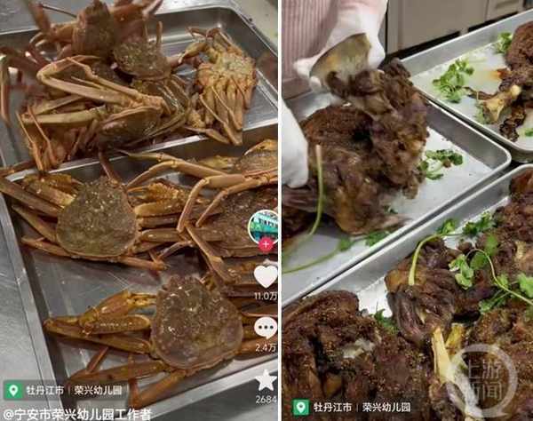 之前的視頻顯示,該幼兒園的食材確實非常豐富:除瞭常見的排骨、魚、雞翅等,連螃蟹、三文魚、涮羊肉、烤羊腿、叫花雞這樣的“大餐”也很多。