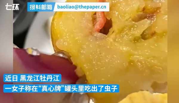 4月6日,據澎湃新聞“七環視頻”報道,近日,在黑龍江牡丹江,一女子稱在“真心牌”罐頭裡吃出蟲。
