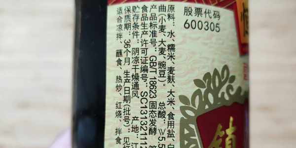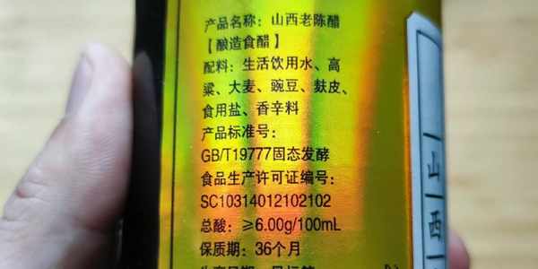 在我國,香醋等同於鎮江香醋。我們拿起醋,看一下它的產品說明表。配料這一欄,註明:水、糯米、麥麩、大米、食用鹽、大曲。總酸為6.5%。產品執行標準號:GB/T18623固態發酵。