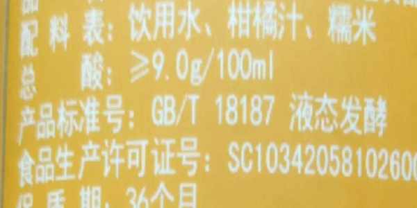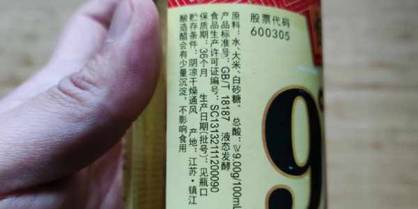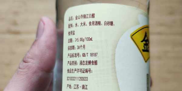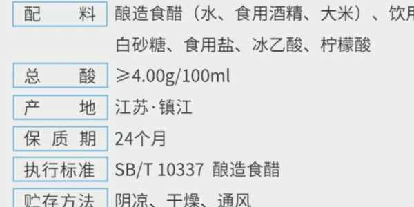 我們拿起米醋,同樣看一下產品說明表。配料這一欄,註明:水、大米、白砂糖。總酸大於9%,一般而言,酸度越高醋越好。產品執行標準號:GB/T18187。後面備註:液態發酵。