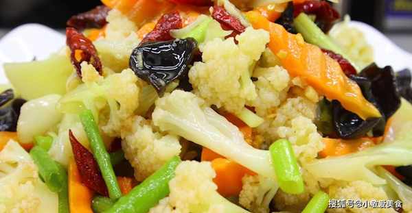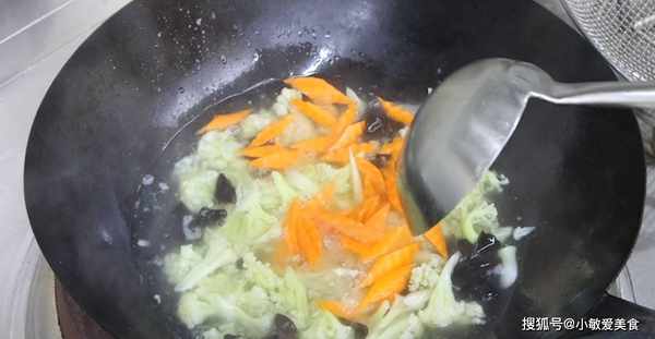 5、起鍋燒水,加入食鹽,增加底味,把菜花放進鍋裡焯一下水,把黑木耳也放進鍋裡順便燙一下。菜花的焯水時間上大概是一分鐘左右,然後再把胡蘿卜放進鍋裡燙個十幾秒鐘。把菜花倒出控水,再放入冷水中過涼。