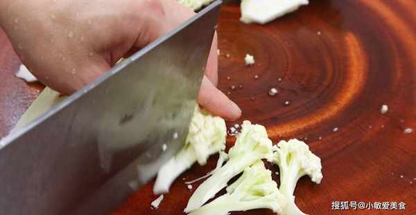 1、把菜花順著根莖切成小塊後放進水裡,撒上一小把幹面粉,利用面粉的吸附能力,把菜花淘洗幹凈。