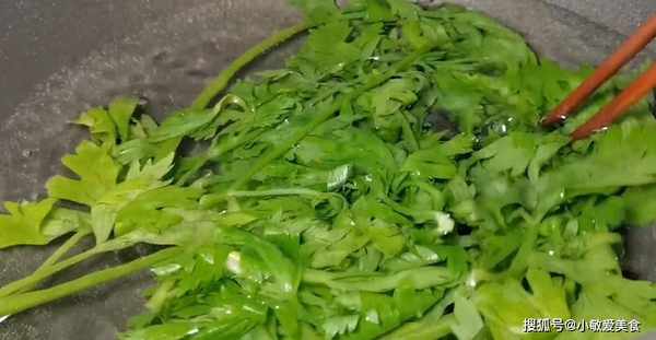 2、鍋中提前把水燒開,放入芹菜葉子用開水燙一下,大概五秒鐘夾起來,放入冷水裡面降溫,把水分擠幹。