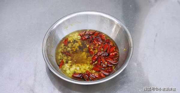 4、鍋裡放油燒熱,燒到冒煙的時候,澆在蒜末、幹辣椒上面,激發出香味,往裡面加入生抽、陳醋。香油一小點,白糖,食鹽,雞精,把調料攪拌均勻。