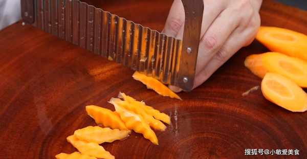 2、胡蘿卜一小截,先斜刀切成段,然後用波浪刀切成片。