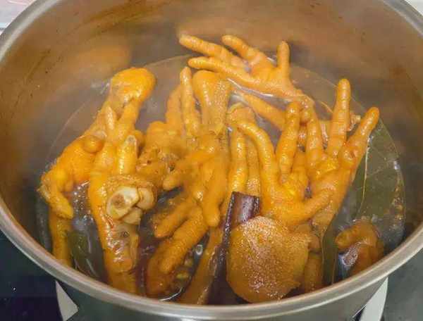 步驟2、加沒過雞爪水,放花椒粒、生薑片,加一勺生抽選蹄豆鍵,等手續辦妥瞭,把它們都倒進炒鍋裡,收汁即可,幾乎留半碗汁水就可以瞭;