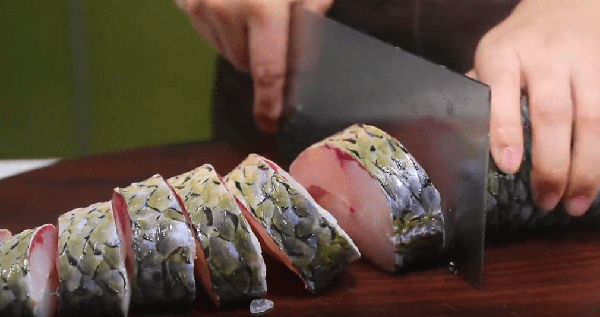2.首先,切掉魚的鰭,並清潔每一個區域。接下來,將草魚切成大約1厘米厚的魚段。我們也可以把魚頭留著吃。