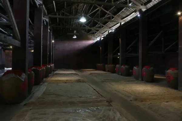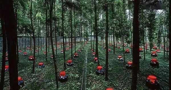 除原酒釀造,儲酒也是極為重要的一環,關系著成酒的品質和風味。三十六坊有兩種儲酒方式,一種是地下藏酒區,恒溫恒濕,自然通風,有助於酒的恒定穩定,可以進行長期儲存,不少客戶選擇在這裡存酒。另一種是露天存酒區,在一片蔥鬱的樹林裡,一個個裝滿酒的陶壇被半埋在泥土裡。目前露天藏酒區有200多壇,約100噸白酒。