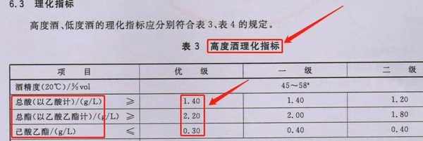 這時就要看理化指標瞭,優級酒要求總酸(g/L)≧1.4,總酯(g/L)≧2.2,乙酸乙酯(g/L)≦0.3;一級酒要求總酸(g/L)≧1.4,總酯(g/L)≧2.0,乙酸乙酯(g/L)≦0.4。可以看出,同樣區別不大。