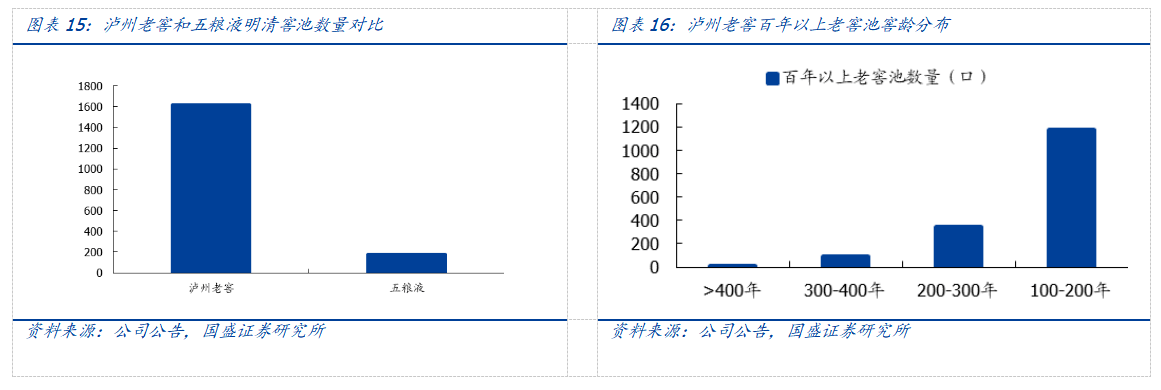 根據公司披露,瀘州老窖共有10086口窖池,其中百年以上老窖池達1619口,占行業內百年老窖池的90%以上,是中國濃香型白酒的發源地。公司始建於明代萬歷年間的國寶窖池群於1573年起釀造至今,448年從未間斷,並於1996年12月經國務院批準成為行業首傢“全國重點文物保護單位”,是我國現存建造最早、持續使用時間最長、保存最完成的原生古窖池群落,在行業內為獨一無二,不可復制的稀缺性資源。我們認為國寶窖池不管是在產品品質還是品牌張力上均為瀘州老窖“底牌”,是公司未來發力高端價格段最強有力的背書。