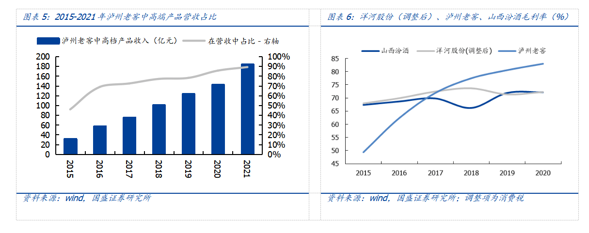 國窖為發展引擎,高舉高打聚焦資源。在五大單品中,國窖作為公司的品牌推手,引領瞭品牌的復興。在廣告投放、費用投放、人員佈局方面,均享受瞭公司的優勢資源,國窖亦不負眾望,銷售收入破百億,營收占比提升至60%以上。與汾酒不同的是,2020年之前老窖的營收和利潤增速主要來自於高端產品的增量,所以在報表端其毛利率的提升幅度顯著快於可比公司。