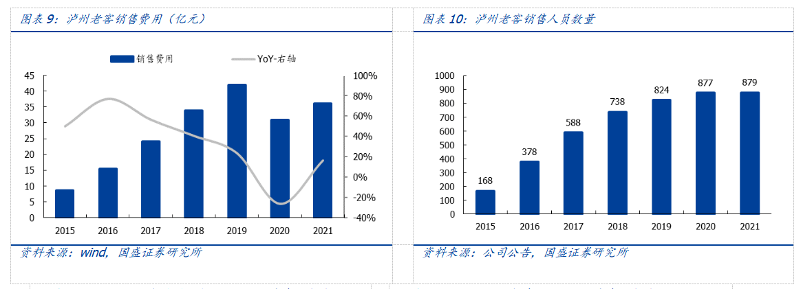 品牌勢能日起,規模效應顯現。2020年成為公司費用投入的“分水嶺”,國窖品牌勢能明顯提升,四川、河北、山東、江浙滬等地國窖消費氛圍日漸濃厚,國窖百億大單品勢能形成,品牌勢能拉動自然動銷。公司保持理性客觀,力保收入較快增長,並強調資源投放的費效比,避免無效的費用支出。2019年之後,從組織人員來看,公司的銷售人員數量趨於穩定;從費用投入來看,公司的銷售費用率成穩步下降態勢,在此策略的帶動下,近年來公司的利潤率水平提升明顯。