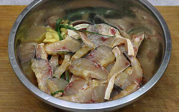 第二步:在清洗幹凈的魚塊中加入薑片和蔥段,然後加入少許鹽調味;然後加入一點生抽和啤酒,用手攪拌均勻(在攪拌過程中,從蔥和生薑中擠出汁液);最後,將魚塊醃制20分鐘,以充分品嘗魚的味道。