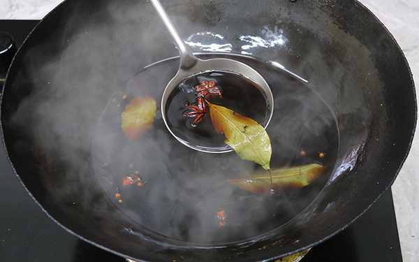 第三步:調味汁。在鍋中加入600克清水,然後加入3個八角、一小塊肉桂和三片香葉;然後在鍋中加入15克醬油、25克醬油和80克白糖(如果你覺得太甜瞭,可以減少一點。在江南地區,這種甜味實際上剛剛好),以及十幾個胡椒,然後用大火煮開;煮沸後,在鍋中加入適量雞精和25克陳醋,用勺子攪拌均勻,關火,最後將煮熟的醬汁倒入一個大盆中,讓其自然冷卻。