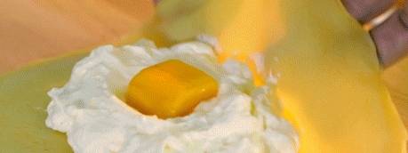 9.取一張晾涼的餅皮,將光滑面朝下,放適量奶油在餅皮中央,再放上芒果塊。