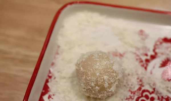 8.將其他水果也用同樣的方法依次包好。為防止相互粘連,將包好的糯米糍放在椰蓉中滾一圈。