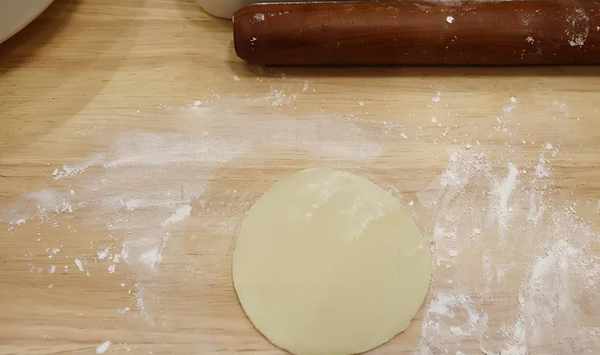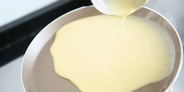6.平底鍋小火預熱,將面糊舀入鍋中,均勻攤成餅皮。