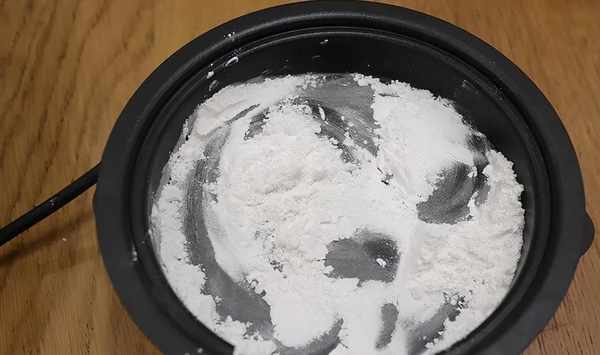 3.制作少許熟糯米粉:鍋中倒入少許糯米粉,用小火炒熟,晾涼備用即可。