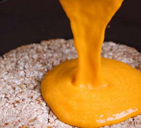 取出均勻倒入南瓜糊,繼續上下火180度,再烤25分鐘取出。