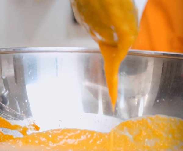 400克南瓜,去皮切片上汽蒸透,過篩擠出細膩的南瓜泥,和面糊混合,南瓜的甜度決定瞭你這道甜品的甜度。所以要買還在戀愛中甜甜的南瓜。