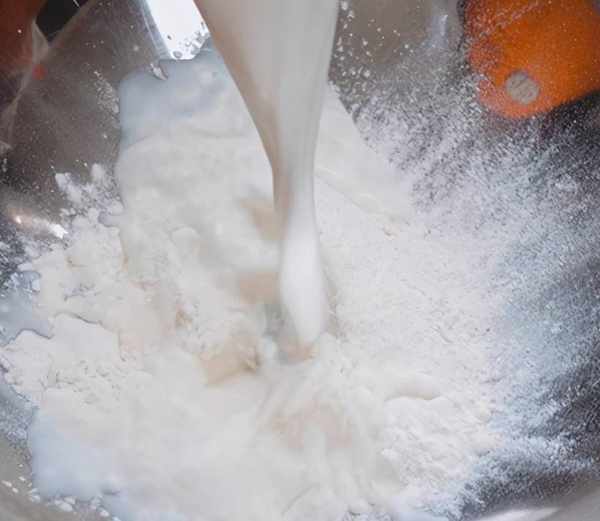 小鋼碗中加40克低筋面粉,80克牛奶,兩顆雞蛋筷子攪打成面糊。(註意不要加糖)