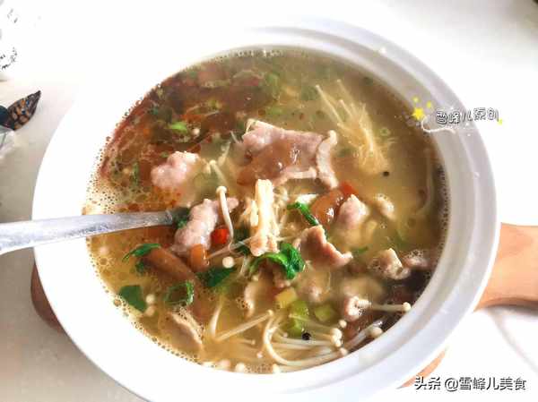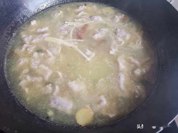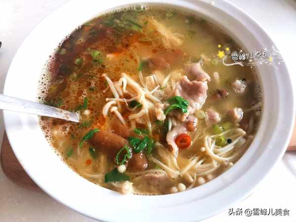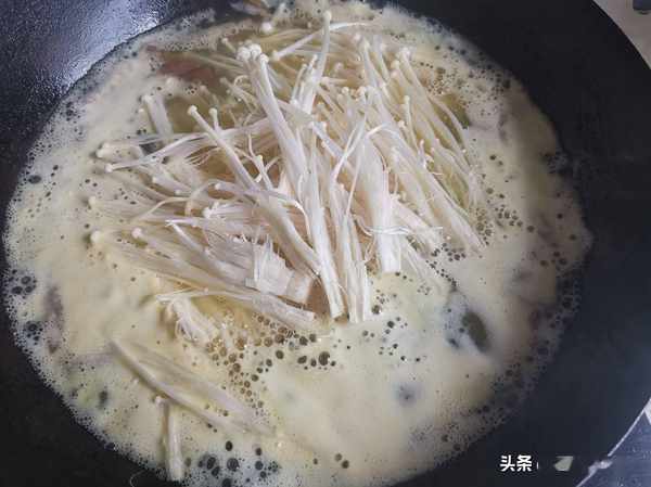 第五步:放入金針菇煮開。金針菇富含維他命、礦物質以及多種胺基酸,其中賴氨酸和精氨酸含量尤其豐富,對增强智力尤其是對兒童的身高和智力發育有良好的作用。我們平時在做菜的時候,多吃一些金針菇很有好處,金針菇和牛肉很搭,尤其金湯肥牛更是離不開金針菇的加入。