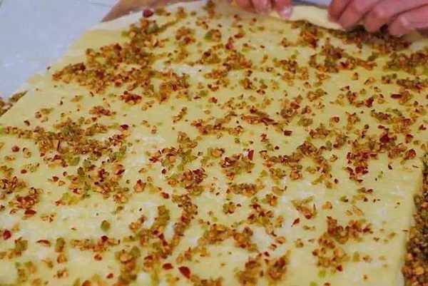 在面板上撒上適量的幹面粉,將醒發好的面團放在案板上揉一下,搓圓壓平,再用搟面杖搟成薄面片,在搟好的面片上面刷上一層油,再將剛才切碎的紅棗梅幹碎撒在上面,撒的均勻一些,然後從一端卷起來,最後封口,兩端的口也要封好,然後用刀切成大小相同的面塊,面塊的大小根據自己的愛好來定。